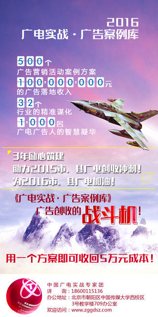 中国广播电视实战专家团,面向全国各级电视台隆重推出《2016广电实战广告案例库》。县级、市级、省级电视台:全国统一价格 5万/套。